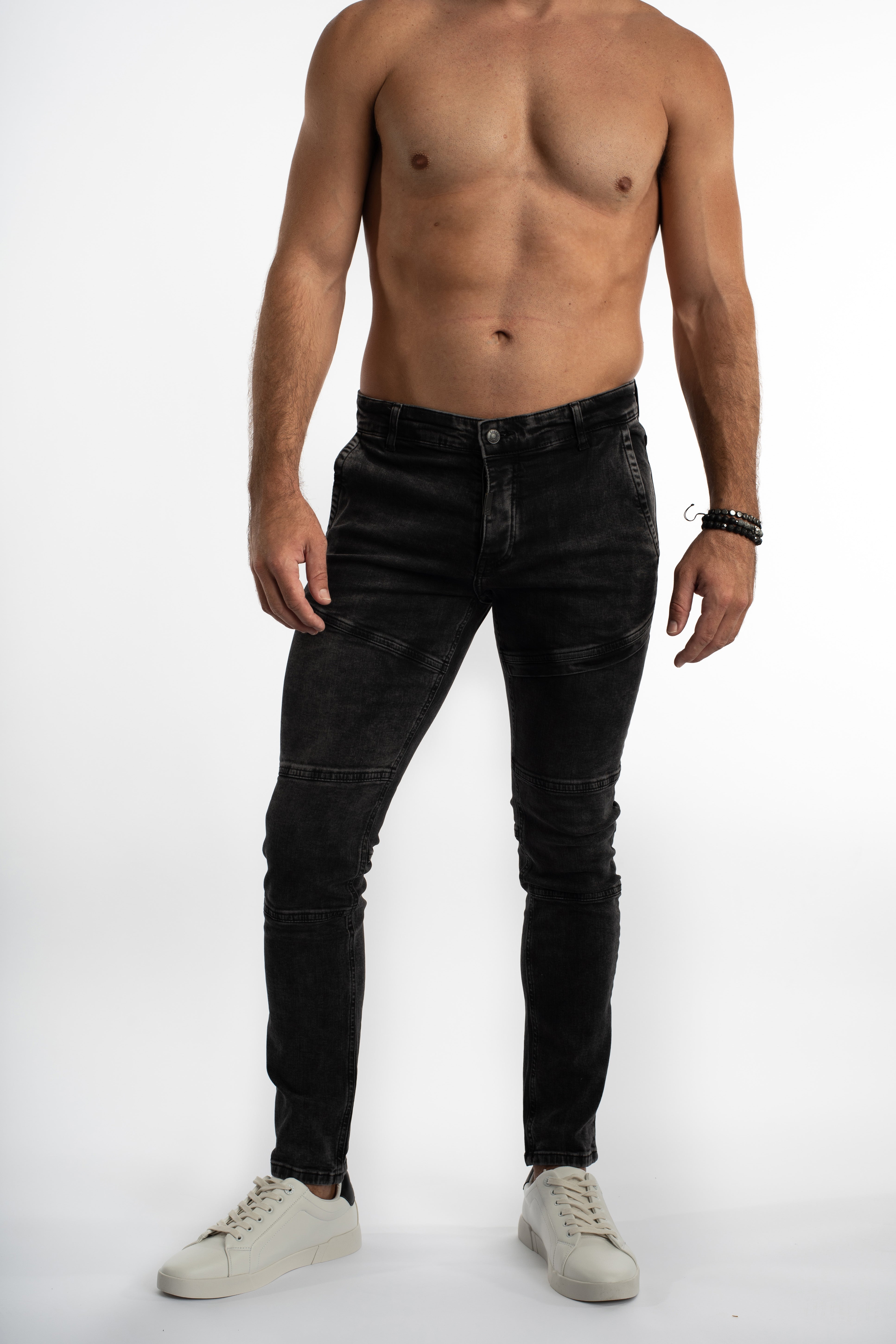 Material: High-grade denim blend (Cotton/Poly mix). Color: Black Washed. Hardware: Custom metal rivets and button closure. Fit: Modern slim-straight profile. Sizing: Available in sizes 29 through 38.