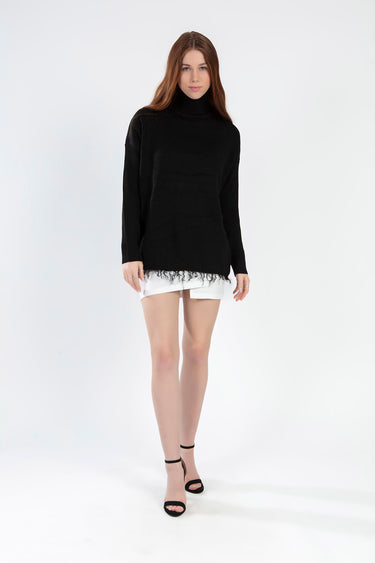 This knit sweater features a relaxed fit and ribbed detailing at the cuffs and hem. The mid-weight fabric provides warmth while remaining breathable for year-round wear. Available in a versatile black colorway to match any outfit in your rotation.