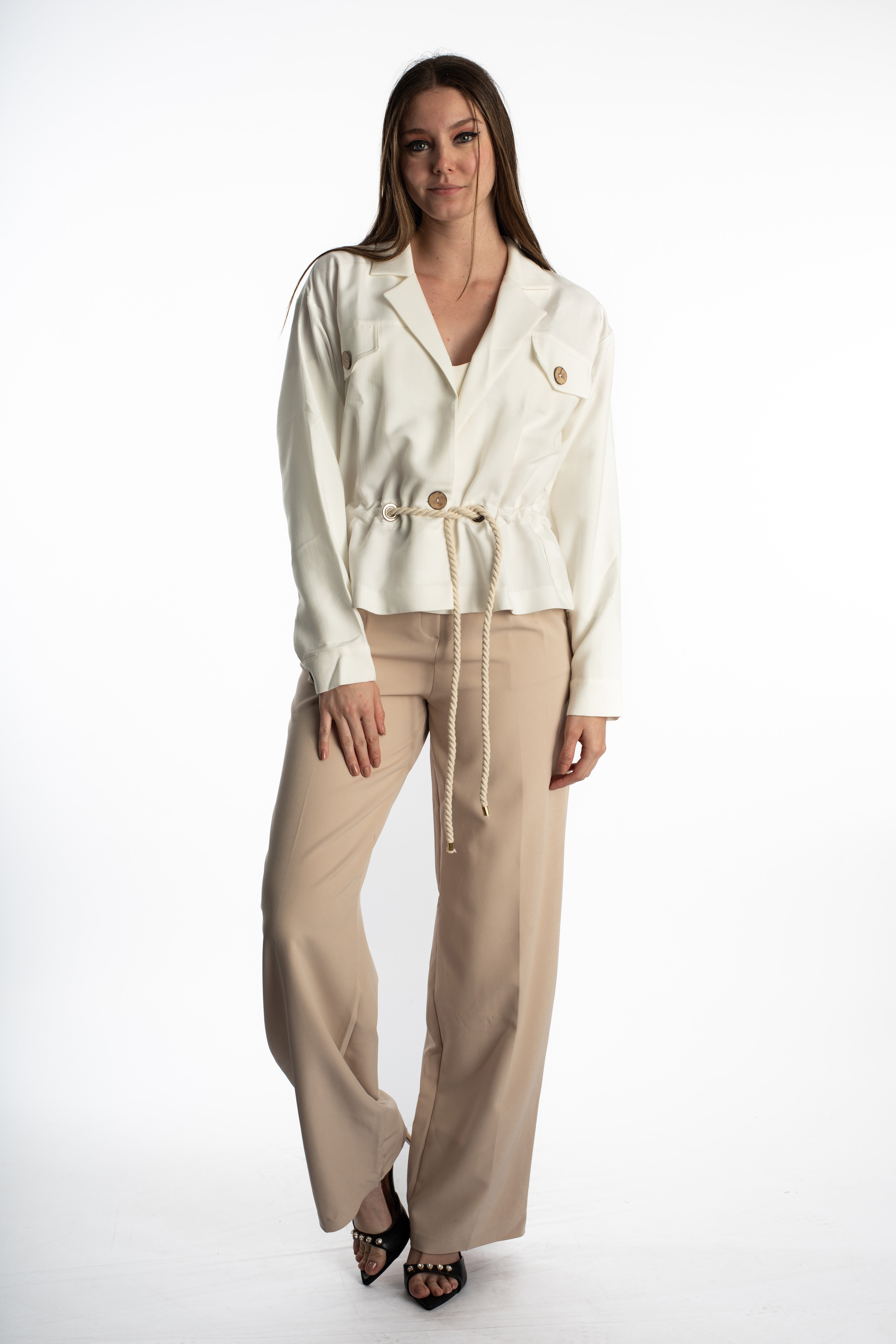 This utility jacket features a classic button-down front with wood-style buttons, dual chest pockets, and a clean white wash. Crafted from durable denim with reinforced stitching and a unique rope drawstring belt for an adjustable fit. Available in sizes XS through L to ensure an inclusive fit for every body type.