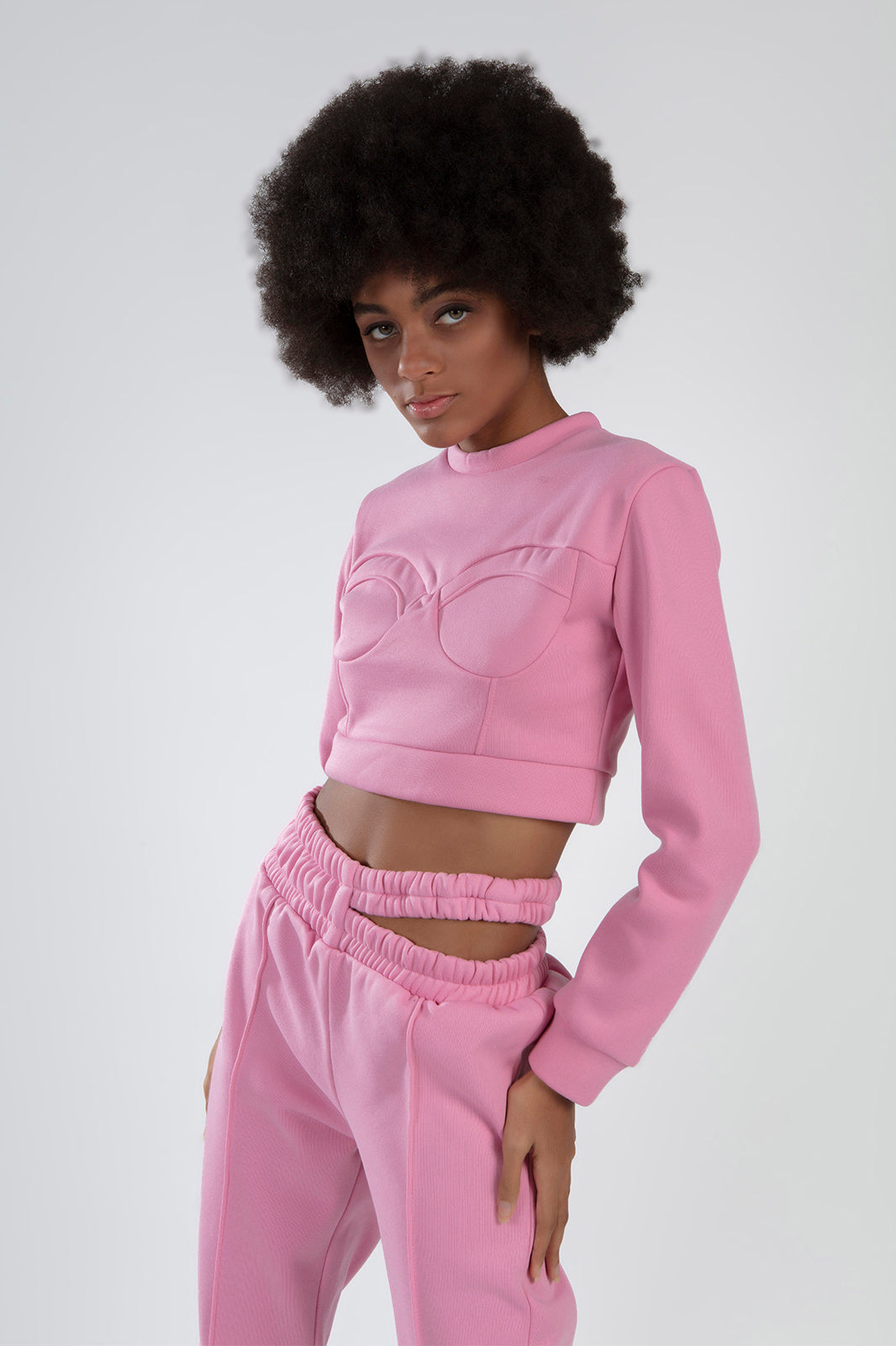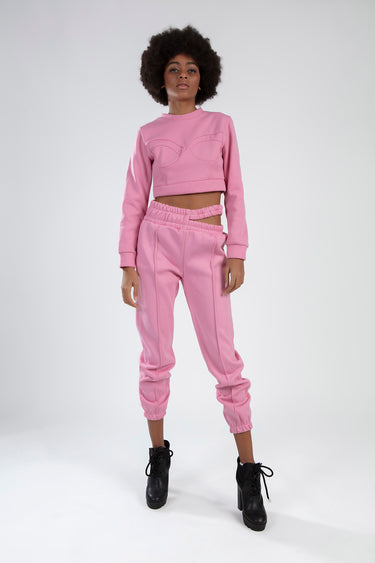 This two-piece set features a cropped graphic top and matching high-waisted bottoms. Made from a durable yet soft cotton-blend fabric with integrated stretch for a body-hugging fit. Available in Black and Pink colorways. Machine wash cold, tumble dry low.